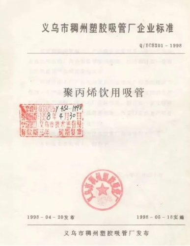1998年 | 《聚丙烯飲用吸管》企業(yè)產(chǎn)品標(biāo)準(zhǔn) |