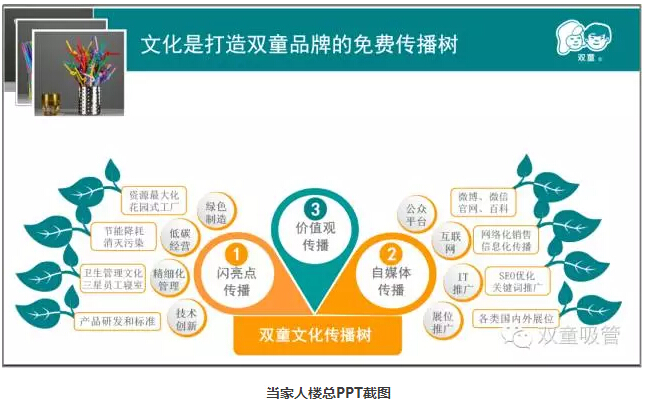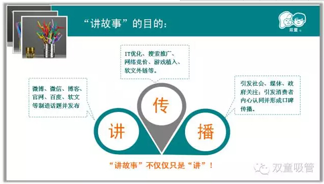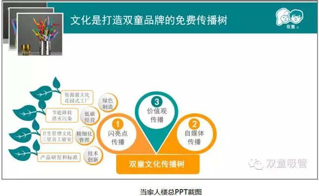 上邊則是政府、媒體關(guān)注的價(jià)值觀傳播。三大部分組成了“雙童”的文化傳播樹!而這棵樹也清晰系統(tǒng)地說明了“雙童”是如何傳播“故事”、塑造品牌的!