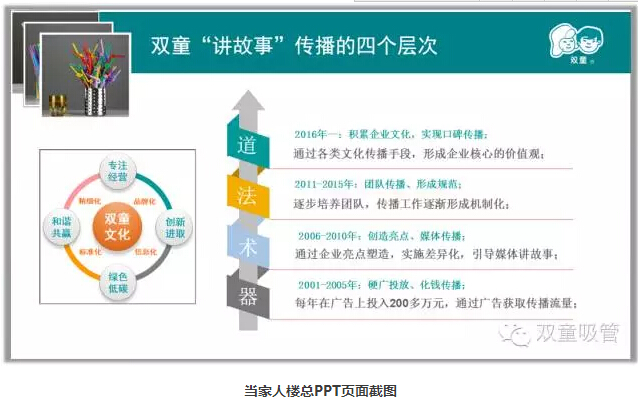 當(dāng)家人也向大家分享了老子的“器”、“術(shù)”、“法”、“道”四個(gè)層次來說明講故事由低到高的過程。“器”靠花費(fèi)廣告費(fèi)去引進(jìn)流量,“術(shù)”靠亮點(diǎn)的塑造、媒體的傳播,而“法”靠培養(yǎng)團(tuán)隊(duì),形成規(guī)范傳播。“雙童”目前講故事的水平還處在“法”的階段,通過講故事把文化傳播出去,進(jìn)一步追求“道”的層面,形成企業(yè)核心的價(jià)值觀,形成企業(yè)文化的口碑傳播。