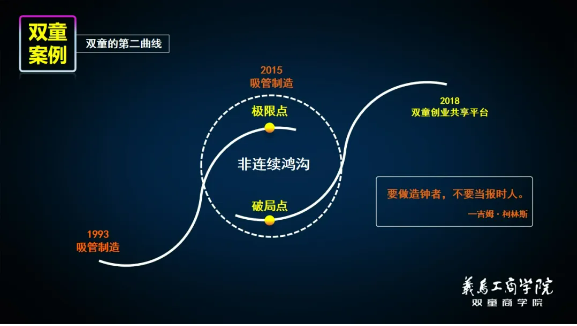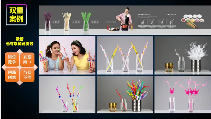 其實(shí)早在2005年時(shí),“雙童”的一條戶(hù)外廣告就打破了“吸管就是喝飲料的”隱含假設(shè),巧妙地將吸管的用途從單一的“喝水”功能向情感化、體驗(yàn)化和娛樂(lè)化等多個(gè)維度延伸,使產(chǎn)品售價(jià)和附加值都得到成倍增長(zhǎng),成功地讓“一根吸管”從“不可能”變成了“可能”。還通過(guò)不斷的要素拆解組合,創(chuàng)造出了上千個(gè)創(chuàng)新形態(tài)的吸管。在2005年的戶(hù)外廣告和會(huì)刊封底廣告中就已經(jīng)打破“吸管只能喝飲料”的隱含假設(shè)“雙童”不同樣式的創(chuàng)意類(lèi)吸管當(dāng)吸管市場(chǎng)趨于飽和時(shí),“雙童”吸管產(chǎn)業(yè)的發(fā)展也已經(jīng)觸碰到了天花板。于是,樓仲平憑借多年的認(rèn)知積累和敏銳的嗅覺(jué),決定順應(yīng)時(shí)代的潮流,發(fā)展“第二曲線(xiàn)”。“雙童”通過(guò)第二曲線(xiàn)打破產(chǎn)業(yè)天花板鑒于一次性塑料制品對(duì)環(huán)境造成的嚴(yán)峻白色污染挑戰(zhàn),“雙童”企業(yè)早在2006年就展現(xiàn)出了前瞻性的視野,預(yù)見(jiàn)到可降解吸管將成為市場(chǎng)與環(huán)保的雙重需求下的必然趨勢(shì)。并開(kāi)始開(kāi)展行之有效的基礎(chǔ)研究和應(yīng)用工作,這項(xiàng)工作被列入當(dāng)年的“浙江省科技攻關(guān)項(xiàng)目”。經(jīng)過(guò)不懈努力,2008年,“雙童”成功研發(fā)出了PLA全生物可降解吸管,這一創(chuàng)新成果不僅有效避免了吸管產(chǎn)品使用后帶來(lái)的白色污染,更為企業(yè)的長(zhǎng)遠(yuǎn)發(fā)展奠定了堅(jiān)實(shí)的技術(shù)基礎(chǔ)。這一提前十多年的戰(zhàn)略布局,不僅豐富了“雙童”的技術(shù)儲(chǔ)備,更為其吸管產(chǎn)業(yè)開(kāi)辟了全新的增長(zhǎng)點(diǎn),被視為推動(dòng)雙童產(chǎn)業(yè)升級(jí)、引領(lǐng)行業(yè)綠色轉(zhuǎn)型的“第二曲線(xiàn)”。“雙童”生物質(zhì)可降解吸管在禁塑令下異軍突起(PLA吸管主要原料為玉米等農(nóng)作物淀粉,使用丟棄后在堆肥條件下45天就可分解為水和二氧化碳,不污染環(huán)境,有效避免了吸管產(chǎn)品使用后帶來(lái)的白色污染。)此后,“雙童”更是將“讓一次性產(chǎn)品告別白色污染”作為企業(yè)使命,并堅(jiān)定往可降解可循環(huán)的方向推進(jìn),相繼開(kāi)發(fā)出聚乳酸吸管、紙質(zhì)吸管、竹子吸管、木質(zhì)吸管、蘆葦吸管、不銹鋼吸管、玻璃吸管、可食用淀粉吸管等環(huán)保產(chǎn)品,推動(dòng)環(huán)境友好型產(chǎn)品逐漸替代傳統(tǒng)的塑料吸管。“雙童”研發(fā)的可降解可循環(huán)吸管德魯克指出:無(wú)論是大企業(yè)還是小企業(yè),都應(yīng)當(dāng)把創(chuàng)新當(dāng)作一項(xiàng)基本功能。企業(yè)的目的是創(chuàng)造顧客。顧客是企業(yè)的基石,是企業(yè)存活的命脈。“雙童“正是通過(guò)這種思維方式,通過(guò)錯(cuò)位、組合、破界,拓寬極大的市場(chǎng),才能打造出獨(dú)特的發(fā)展之路!一根吸管都可以,沒(méi)有什么是不可以的!