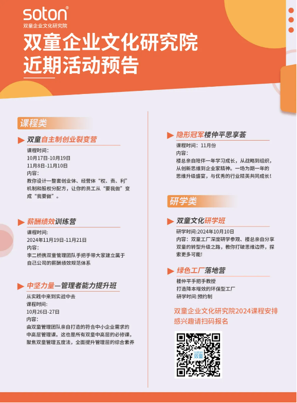 時(shí)至今日,董事長(zhǎng)樓仲平更多地活躍在講臺(tái)與課堂之上,他不僅把雙童的事業(yè)和商學(xué)案例不斷地向外傳遞力量,還造就了新時(shí)代企業(yè)家的隊(duì)伍,促進(jìn)了地方經(jīng)濟(jì)、企業(yè)和管理思想的傳播。