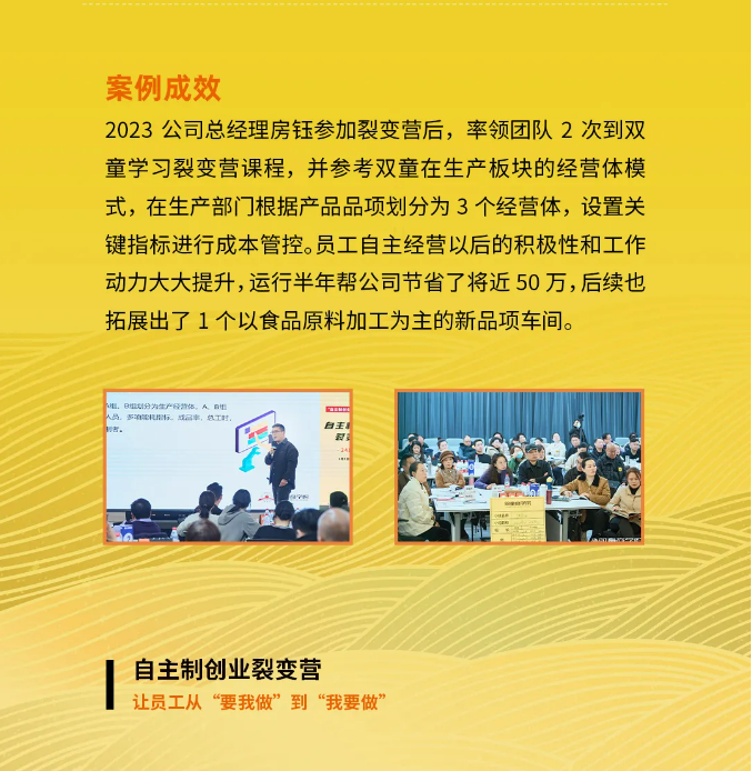 而《自主制創(chuàng)業(yè)裂變營》就是依托該機(jī)制,把“雙童”的落地實(shí)操方法與成功經(jīng)驗(yàn)經(jīng)驗(yàn)有機(jī)結(jié)合,不斷打磨、升級的一套針對中小微企業(yè)的管理課程。