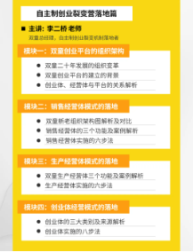 落地實(shí)操篇則由雙童總經(jīng)理李二橋進(jìn)行交付!作為裂變機(jī)制的執(zhí)行者,他以雙童內(nèi)部對裂變機(jī)制的實(shí)際運(yùn)行狀況為案例教材,將課程分為五大模塊,16個(gè)小節(jié),盡可能最詳細(xì)、最全面地交付給學(xué)員操作方法!