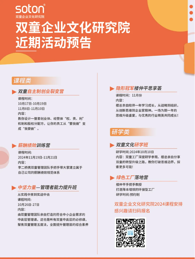 3)雙童在不斷的成長,科學(xué)地解決了一般民營中小企業(yè)普遍面臨的管理層的改革,二代轉(zhuǎn)型問題。雙童的“再造經(jīng)理人”和創(chuàng)業(yè)共享平臺都提供了相當(dāng)好的思路,值得大家借鑒學(xué)習(xí)。