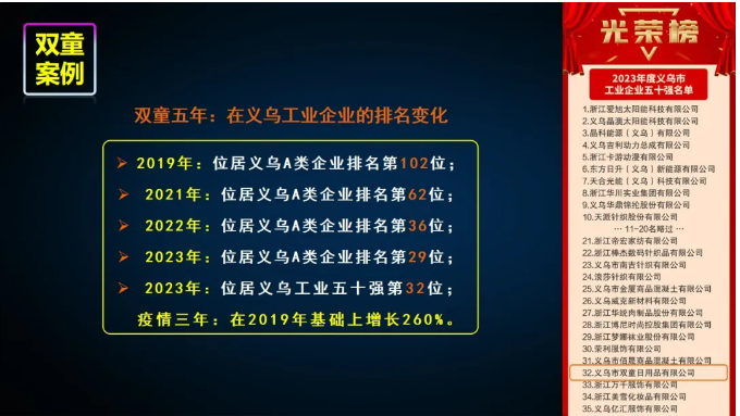 通過該機(jī)制,雙童已經(jīng)形成了以吸管制造業(yè)為基礎(chǔ),以國際貿(mào)易和創(chuàng)業(yè)教育兩大板塊為融合的新的產(chǎn)業(yè)模式,做到了輕重結(jié)合、虛擬結(jié)合,不僅讓雙童業(yè)績實現(xiàn)連年攀升,增強(qiáng)了企業(yè)的活力和反脆弱性,同時實現(xiàn)了企業(yè)和員工的共同富裕!