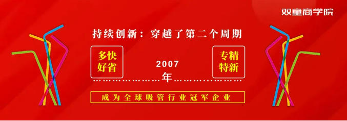通過(guò)打破“吸管只能用來(lái)喝水”的隱含假設(shè),運(yùn)用創(chuàng)新思維,讓吸管從單一的“喝水”功能向情感化、體驗(yàn)化和娛樂(lè)化延伸,滿足了中小客戶群體的定制化需求,開(kāi)辟了一個(gè)獨(dú)屬于雙童的商業(yè)“藍(lán)海”!并通過(guò)持續(xù)的創(chuàng)新,讓雙童又穿越了一個(gè)周期,完成了從“多快好省”到“專精特新”的轉(zhuǎn)變,成為吸管行業(yè)當(dāng)之無(wú)愧的“隱形冠軍”!