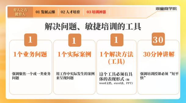 清晰的發(fā)展路徑能夠增加員工留下來的意愿。所以程老師建議管理者們建立完善的員工發(fā)展云梯,比如按照專業(yè)管理、專業(yè)技術、生產(chǎn)操作和業(yè)務等不同類別設計清晰的上升路徑。同時在新人上升的不同階段,要及時給與對應的幫扶與賦能。程老師也在課上給到了實際操作方法和“11130”模型培訓神器,讓同學們隨學隨用。