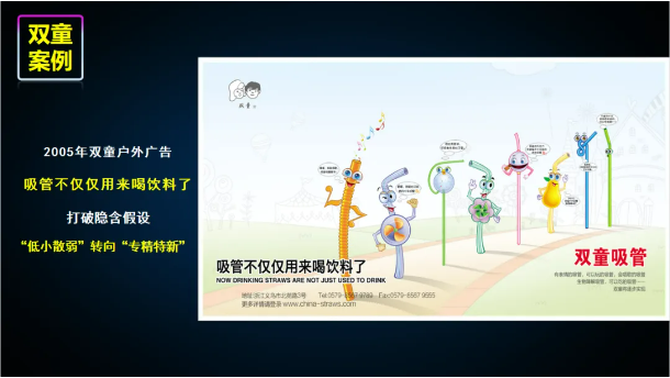 早在2004年,“雙童”就打破了“吸管就是喝飲料的”隱含假設(shè),把它從單一的“喝水”功能向情感化、體驗(yàn)化和娛樂化延伸,從而給不起眼的小小吸管賦予新的生命,徹底讓“一根吸管”從“不可能”變成了“可能”。