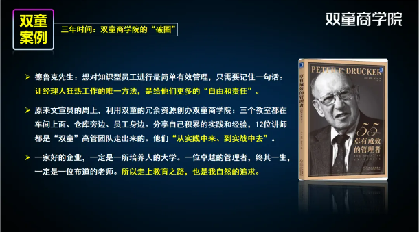 傳統(tǒng)管理中“胡蘿卜加大棒”的方式,對新生代年輕的員工逐漸失效。樓仲平以雙童商學(xué)院的“破圈“之路為例,論證了企業(yè)對新生代員工,更應(yīng)該 “尊重人性、順應(yīng)人心”,從而實現(xiàn)“心理動機,初心動念”轉(zhuǎn)變,撬動一批批的優(yōu)秀人才。