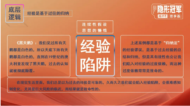 所以樓老師在課上,選用經典的“黑天鵝”和“感恩節(jié)的火雞”作為教學案例,讓同學們明確認識到:經驗的底層邏輯是基于過往的歸納,但世界是“非連續(xù)性”的,對過去的歸納總結對未來未必有效,想象力需要反叛精神。