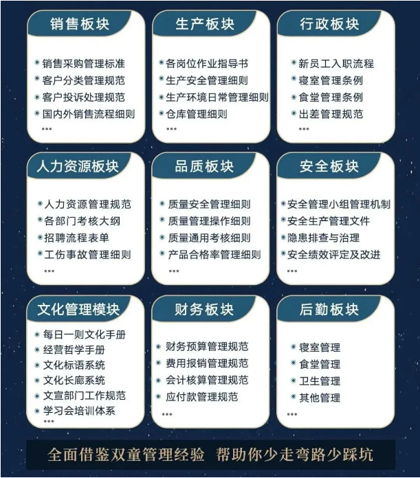 所以,入學“隱形冠軍樓仲平思享薈”之后,項目組會將“雙童”積累了30年、包含了銷售、生產、行政、人類資源、品質、安全、文化管理、財務和后勤等9大板塊,近600份管理規(guī)范文件,全部打包給學員,幫助學員企業(yè)能夠全面借鑒雙童管理經驗、少走彎路、少踩坑!