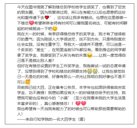 感謝樓仲平先生的捐資助學(xué),愛心成就夢想,助學(xué)點(diǎn)燃希望。獎(jiǎng)學(xué)金的捐贈(zèng),不僅僅是一份物質(zhì)上的支持,更是一種精神上的激勵(lì),它將鼓舞著同學(xué)們努力學(xué)習(xí),奮發(fā)向上。