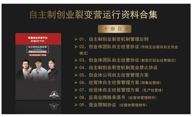 3)組織治理模塊:《自主制創(chuàng)業(yè)裂變營(yíng)》專(zhuān)注于組織機(jī)制創(chuàng)新,幫助學(xué)員輸出一套企業(yè)組織創(chuàng)新方案,激發(fā)個(gè)體活力,推動(dòng)企業(yè)裂變式增長(zhǎng)。