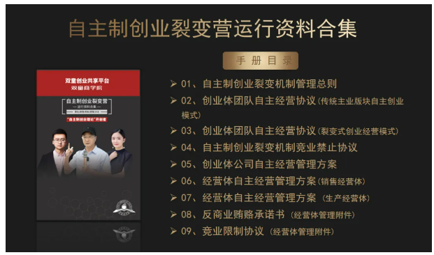 3、交付自主制創(chuàng)業(yè)裂變模式的各項(xiàng)規(guī)則、文本、合同等書面資料