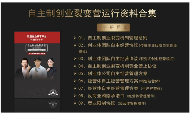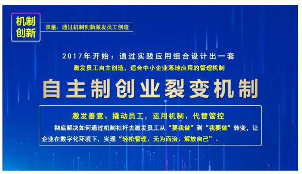 于是他果斷選擇破界創(chuàng)新,尋求企業(yè)發(fā)展的“第二曲線”,并結(jié)合多種組織機(jī)制和中小企業(yè)的特點(diǎn),自制了一套適用于中小企業(yè)的組織創(chuàng)新制度——自主制創(chuàng)業(yè)裂變機(jī)制,搭建創(chuàng)業(yè)共享平臺,激發(fā)員工從“要我做”到“我要做”。