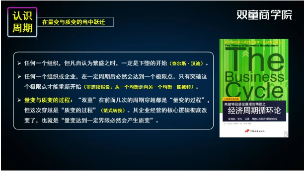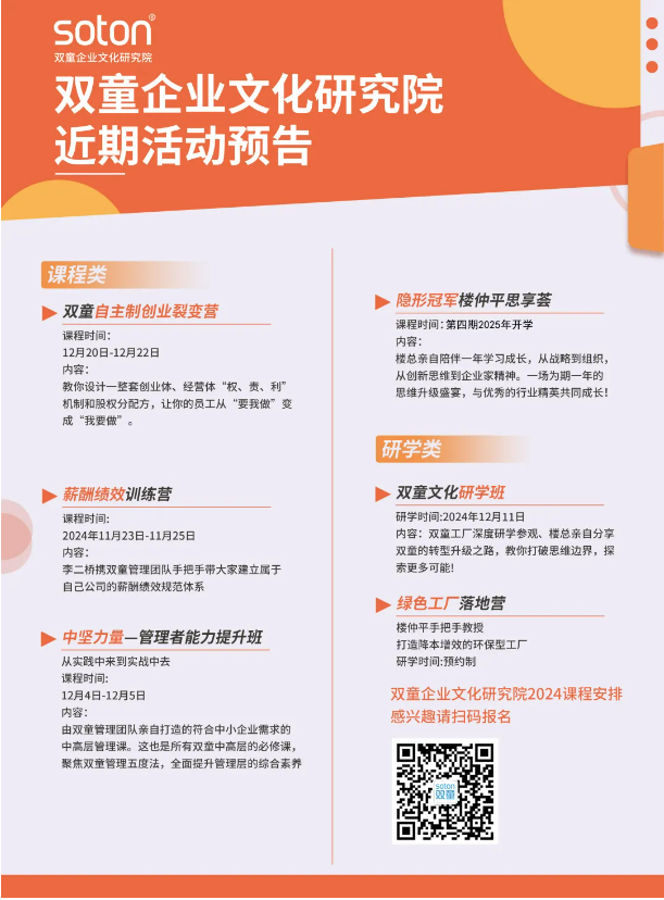個體的進化是組織進化的前提,創(chuàng)業(yè)者的“成長活性”驅動著企業(yè)的“成長活性”。所以樓仲平個人的持續(xù)進化,也推動了雙童這家企業(yè)在30年間,不斷穿越一個個經營周期,并持續(xù)充滿活力!