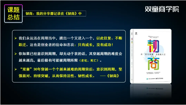 在整場主題分享中,樓總希望通過對自己和雙童成長周期的案例進行歸納、不斷探索和分析,能夠幫助現(xiàn)場的創(chuàng)業(yè)者們在雙童身上找到中小民營企業(yè)的共性,理解周期規(guī)律、突破心智、開門破圈,也希望能影響他們對企業(yè)經營保持敬畏,轉變認知,從而帶領自己的企業(yè)突破周期,韌性成長。