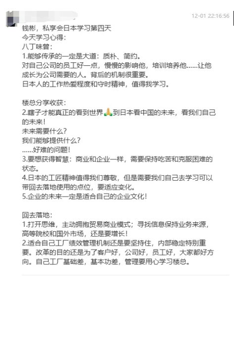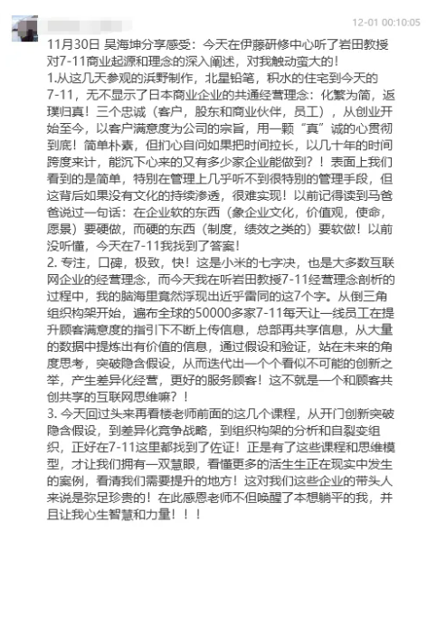 無論是7-11便利店以客戶為中心并持續(xù)創(chuàng)新突破的經(jīng)營理念,還是京瓷集團對文化的重視、稻盛先生“敬天愛人”的思想,都給同學們帶來了不同程度的啟發(fā),也讓大家對往期“弟子班”的課程內(nèi)容有了新的理解。