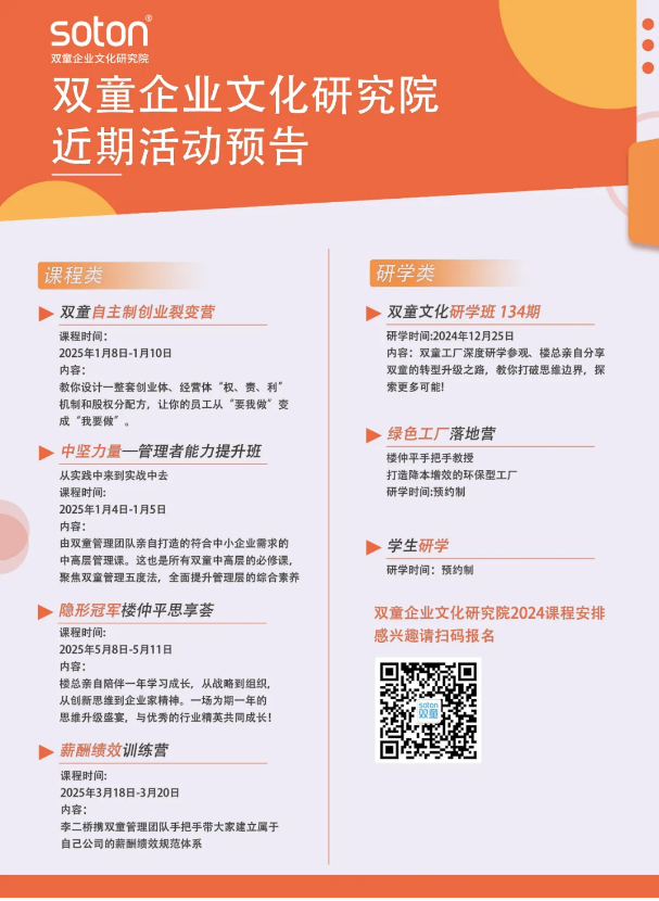 當時確實是面臨企業(yè)生存的問題,需要開辟“第二曲線”。最初并沒有計劃要做商學院,甚至在接受邀請時我都拒絕了。疫情期間,雙童平臺孵化了十幾個員工創(chuàng)業(yè)項目。那時,一位小姑娘看到同事們紛紛開始創(chuàng)業(yè),她也產生了創(chuàng)業(yè)的想法。她來找我時提到,既然我能到這么多大學去講課,為什么我們不能自己開設一個學習中心?經過一番思考,我決定開設學習中心,最終發(fā)展成了今天的雙童商學院。