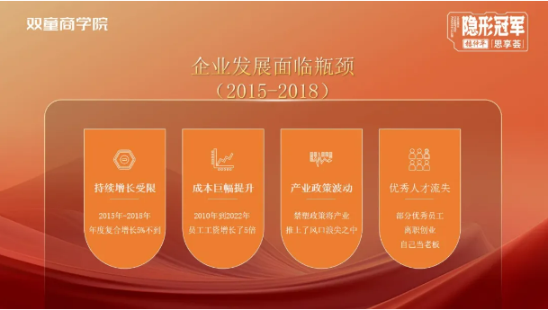 2015-2018年,雙童的發(fā)展進(jìn)入了瓶頸期:持續(xù)增長(zhǎng)受限,成本大幅度提升,產(chǎn)業(yè)政策造成了很大波動(dòng),優(yōu)秀人才的也開(kāi)始流失。這些都是亟待解決的難題。