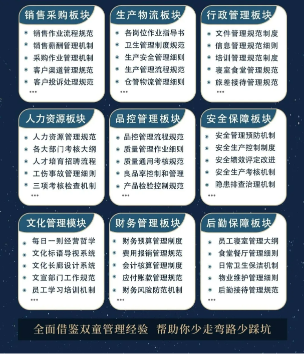 所以,入學(xué)“隱形冠軍樓仲平思享薈”之后,項(xiàng)目組會(huì)將“雙童”積累了30年、包含了銷售、生產(chǎn)、行政、人力資源、品質(zhì)、安全、文化管理、財(cái)務(wù)和后勤等9大板塊,近600份管理規(guī)范文件,全部打包給學(xué)員,幫助學(xué)員企業(yè)能夠全面借鑒雙童管理經(jīng)驗(yàn)、少走彎路、少踩坑!