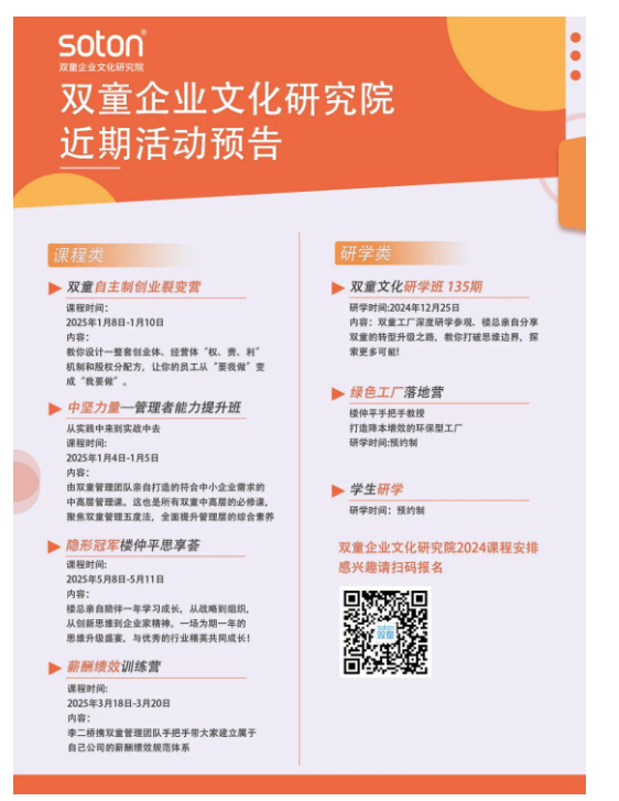 如果你也對“雙童”充滿好奇,也想賦能團(tuán)隊(duì)共同成長,歡迎走進(jìn)12月25日【雙童文化研學(xué)班】,與上百位優(yōu)秀的創(chuàng)業(yè)者一起學(xué)習(xí)!少量名額,歡迎咨詢鎖定!