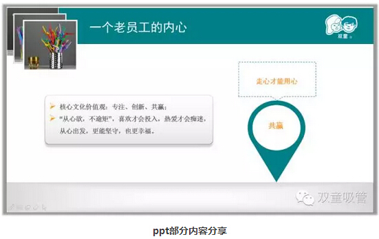 學(xué)習(xí)會(huì)進(jìn)行到最后,我們的李總也上臺(tái)發(fā)言了。他說(shuō),這本教材書籍其實(shí)是當(dāng)家人樓總和幾位主要的高層領(lǐng)導(dǎo)全部看過(guò)這本書后,覺(jué)得這本書相當(dāng)契合我們雙童的企業(yè)文化,決定送給每個(gè)員工一本!也希望大家可以提前預(yù)習(xí),以后多多上臺(tái)發(fā)表讀后感!哈哈,放心吧,吸管妞今天晚上就看!