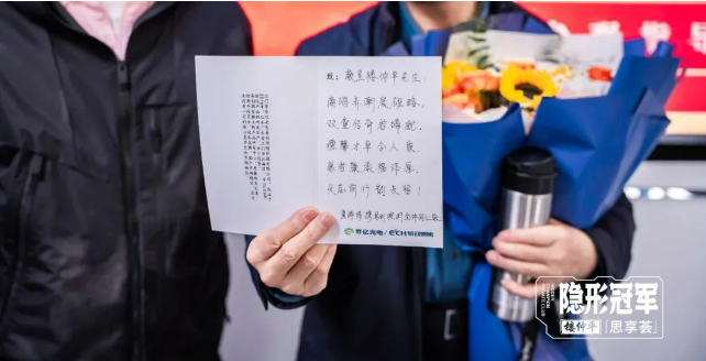 創(chuàng)始人夏濤濤夫婦不僅給樓仲平老師獻上鮮花以表敬意,更是特意手寫了一首原創(chuàng)詩,“商海弄潮展雄略,雙童傳奇君締就,德馨才卓令人崇,愿君康泰福澤厚,矢志前行韻長留!”表達了對樓仲平老師的敬仰與祝福。