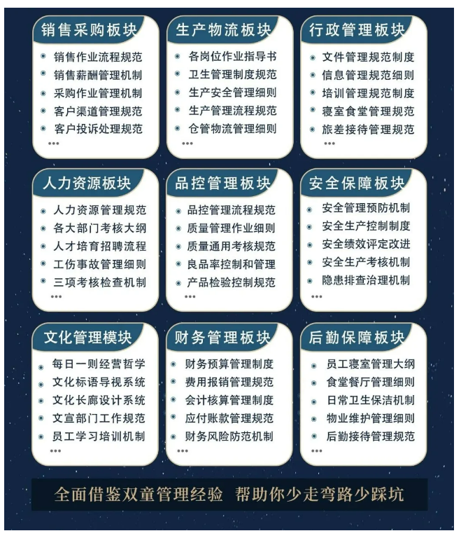 所以,入學(xué)“隱形冠軍樓仲平思享薈”之后,項目組會將“雙童”積累了30年、包含了銷售、生產(chǎn)、行政、人力資源、品控、安全、文化管理、財務(wù)和后勤等9大板塊,近600份管理規(guī)范文件,全部打包給學(xué)員,幫助學(xué)員企業(yè)能夠全面借鑒雙童管理經(jīng)驗、少走彎路、少踩坑!