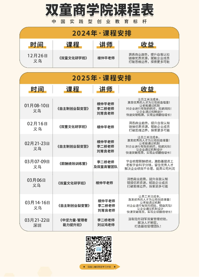 如果你也對(duì)“雙童”充滿好奇,也想賦能團(tuán)隊(duì)共同成長,歡迎走進(jìn)12月26日【雙童文化研學(xué)班】,與上百位優(yōu)秀的創(chuàng)業(yè)者一起學(xué)習(xí),也是年前最后一期,抓住機(jī)會(huì)哦!