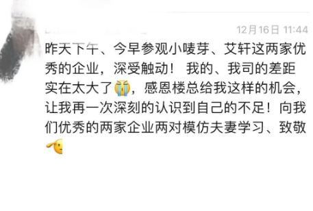 樓仲平老師還感慨道:他看到小濤身上流露出的那份堅韌不拔,仿佛映照出二十多年前的自己。同時,此次盟鵬搬遷后的嶄新面貌,不禁眼前一亮,不僅在基礎管理的層面實現(xiàn)了顯著的提升,現(xiàn)場管理更是煥然一新。本次來到盟鵬研學交流,所目睹的一連串驚喜變化,遠遠超出了大家的預期。希望盟鵬團隊在2025年能夠迸發(fā)出更強大的活力與激情,實現(xiàn)業(yè)績的飛躍和管理上的持續(xù)優(yōu)化!