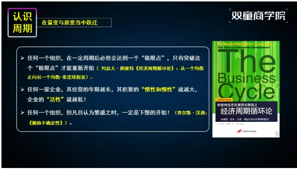 在中小企業(yè)平均壽命不到三年的情況下,企業(yè)正面臨著越來越難的經(jīng)濟(jì)周期,如何讓企業(yè)持續(xù)保持足夠的“活性”和“活力”, 需要?jiǎng)?chuàng)業(yè)者擁有強(qiáng)烈的經(jīng)營“周期意識(shí)”,只有認(rèn)識(shí)周期,才能防范周期,進(jìn)而帶領(lǐng)企業(yè)穿越周期!