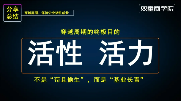 但是,如果已經(jīng)意識(shí)到周期,卻無動(dòng)于衷的話,其穿越周期的難度會(huì)越來越高,最后極有可能被周期所限(老化、死亡)。所以在分享的最后,樓老師也鼓勵(lì)現(xiàn)場年輕的企業(yè)家們,一定要對“周期”予以重視并積極應(yīng)對,讓自己的企業(yè)不是“茍且偷生”,而是有尊嚴(yán),有活性,有活力,“基業(yè)長青”的活著!