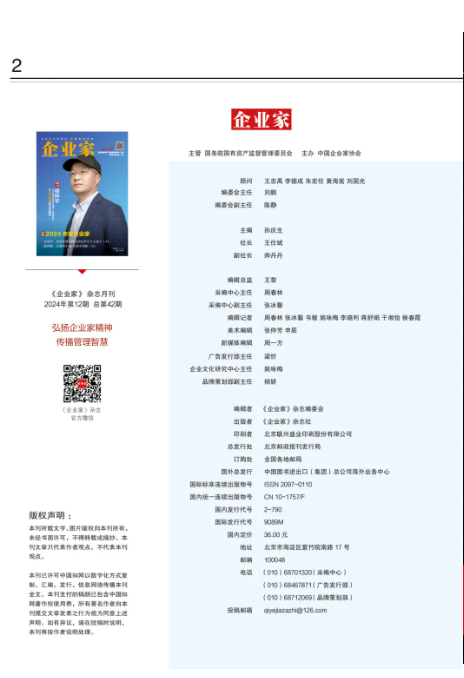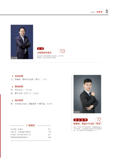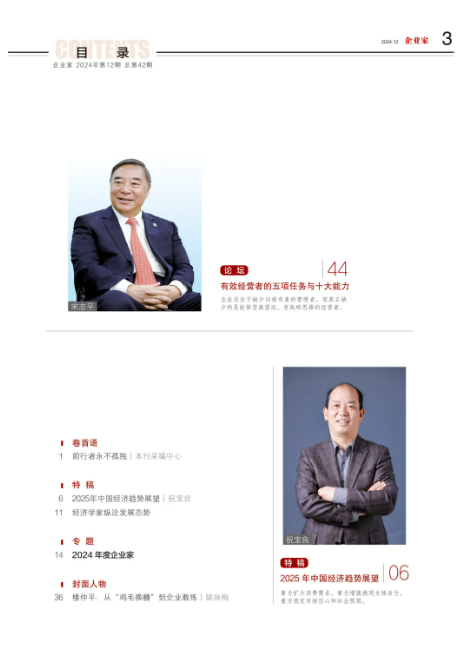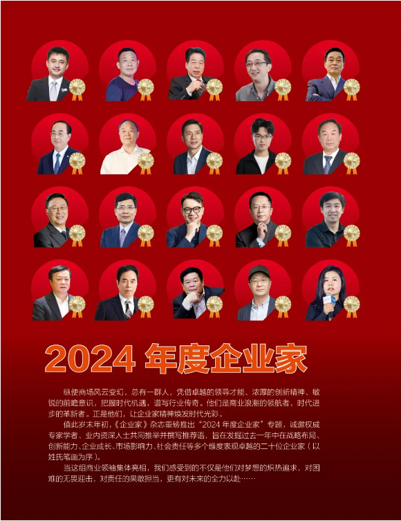 值此歲末年初,《企業(yè)家》雜志重磅推出“2024年度企業(yè)家”專(zhuān)題,誠(chéng)邀權(quán)威專(zhuān)家學(xué)者、業(yè)內(nèi)資深人士共同推舉并撰寫(xiě)推薦語(yǔ),旨在發(fā)掘過(guò)去一年中在戰(zhàn)略布局、創(chuàng)新能力、企業(yè)成長(zhǎng)、市場(chǎng)影響力、社會(huì)責(zé)任等多個(gè)維度表現(xiàn)卓越的二十位企業(yè)家(以姓氏筆畫(huà)為序)。