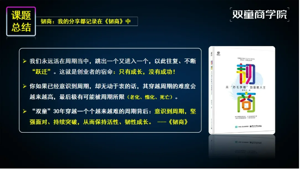所以,樓老師正是想要通過(guò)自己和雙童的案例,影響在座的企業(yè)家及同學(xué)們,一定要重視“周期意識(shí)”,因?yàn)橹挥姓J(rèn)識(shí)周期,才能防范周期,進(jìn)而帶領(lǐng)企業(yè)穿越周期!讓自己的企業(yè)不是“茍且偷生”,而是有尊嚴(yán),有活性,有活力,“基業(yè)長(zhǎng)青”的活著!