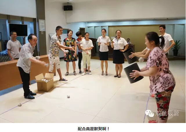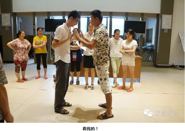 “太極推推樂?”這個(gè)游戲是讓每組夫妻派出一人應(yīng)戰(zhàn)。對(duì)抗的兩人面對(duì)面站立,雙方相互之間輕推對(duì)方的手掌,對(duì)方的腳最先離開原來站立的點(diǎn),誰(shuí)就輸了??炜?!我們的妻子們可賣力啦,丈夫們也毫不示弱,場(chǎng)面可真是熱鬧呀!