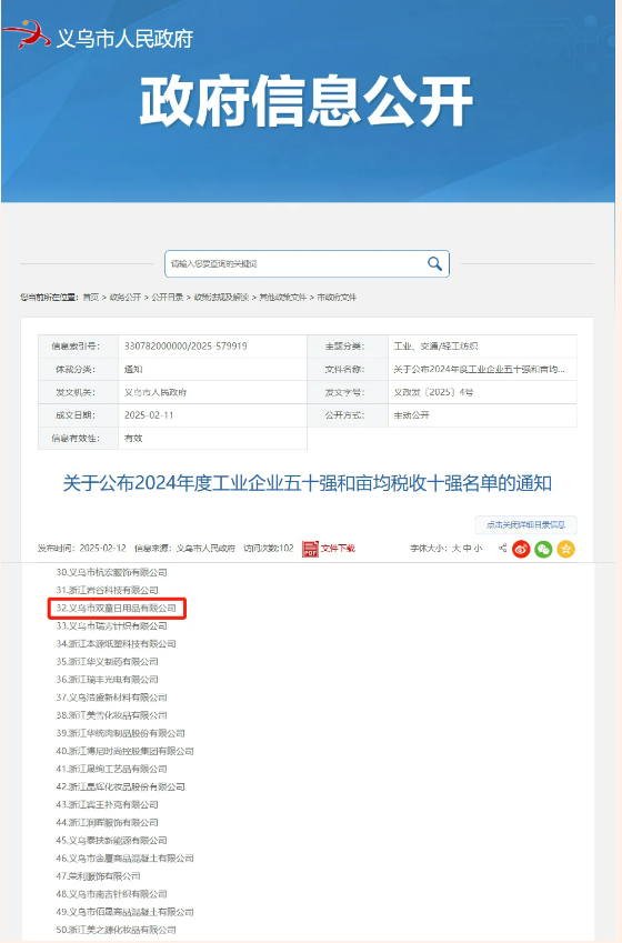 2月12日,義烏市人民政府網(wǎng)公布了“2024年度工業(yè)企業(yè)50強(qiáng)”名單,雙童創(chuàng)業(yè)共享平臺(tái)第一創(chuàng)業(yè)體(雙童日用品有限公司)與2023年蟬聯(lián)同榜同序,位居第32位!