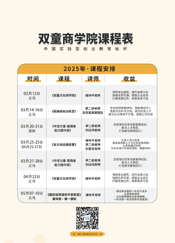 如果你也對(duì)“雙童”充滿好奇,也想全面了解“雙童”的企業(yè)文化、經(jīng)營(yíng)理念、精細(xì)化管理,通過系統(tǒng)的課程深入地探索、學(xué)習(xí)“雙童”成為行業(yè)“隱形冠軍”的底層邏輯,從而賦能自己的企業(yè),歡迎咨詢報(bào)名“雙童”課程!
