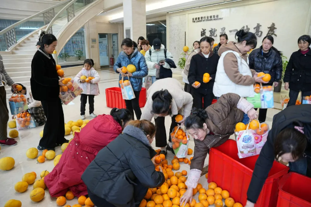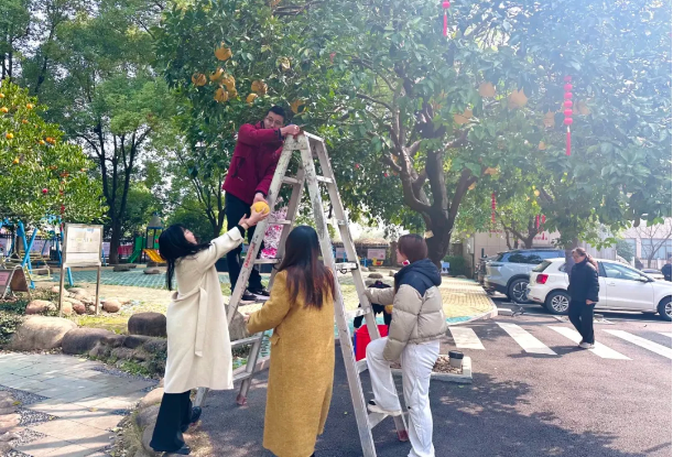 所以雙童組織女同胞們一起來采摘、分發(fā)!搭上梯子、帶上框子,一群人圍在柚子樹下期待著美味的果實。