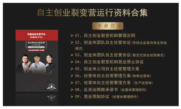 作為自主創(chuàng)業(yè)裂變機(jī)制的首創(chuàng)企業(yè),“雙童”在從傳統(tǒng)制造業(yè)向商業(yè)模式轉(zhuǎn)型的過(guò)程中,積累了大量的實(shí)戰(zhàn)經(jīng)驗(yàn),也更懂得中小企業(yè)在轉(zhuǎn)型中各個(gè)階段遇到的痛點(diǎn)、難點(diǎn)。所以,“雙童”樓仲平閉關(guān)3個(gè)月,親自寫(xiě)的20多萬(wàn)字《自主創(chuàng)業(yè)裂變營(yíng)運(yùn)營(yíng)資料合集》,報(bào)名參課,即免費(fèi)附贈(zèng)!這本書(shū)濃縮了雙童20多年的科學(xué)管理經(jīng)驗(yàn)和操作方法,包含了創(chuàng)業(yè)體、經(jīng)營(yíng)體制定的實(shí)操方案,可作為裂變機(jī)制在企業(yè)內(nèi)推行的指導(dǎo)文本,幫助學(xué)員企業(yè)能夠全面借鑒雙童管理經(jīng)驗(yàn)、少走彎路、少踩坑!與3天2夜的課程搭配使用,效果翻倍!同時(shí)《資料合集》里面包含了各類(lèi)合同協(xié)議,適用范圍非常廣,學(xué)習(xí)者可以在落地實(shí)操環(huán)節(jié)即改即用!