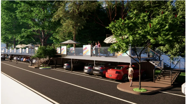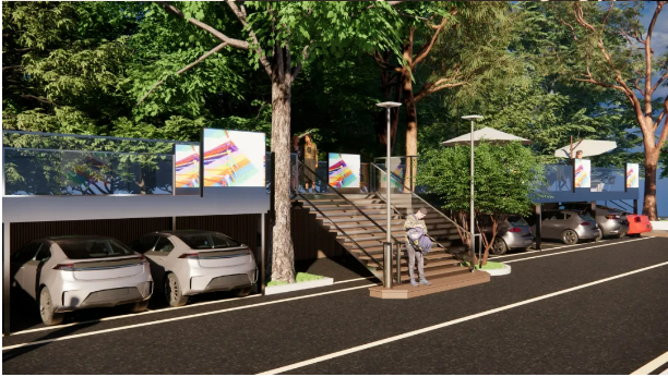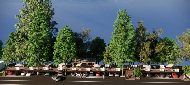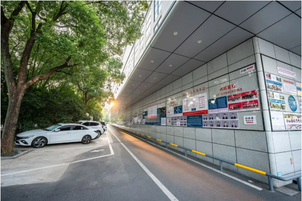 雙童的百米文化長廊對面正是一片樹林和停車場,只需要設計一個懸空走廊,既保住了原有的樹木,還留住了停車場地,又可以有一塊新的員工休閑區(qū),三全其美!