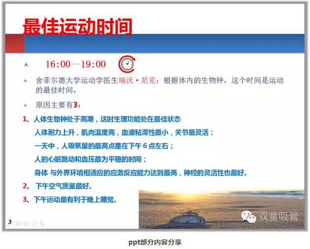 首先是朱主任給我們分享《我們應該知道的生活、運動和傷病常識》課程,大家是不是都覺得清晨運動是很好的健身方式,其實清晨是不宜運動的,這時候人的身體狀態(tài)最差,最佳的運動時間應該是16:00—19:00。在日常生活中,大家是不是都存在這樣的誤區(qū)呢?