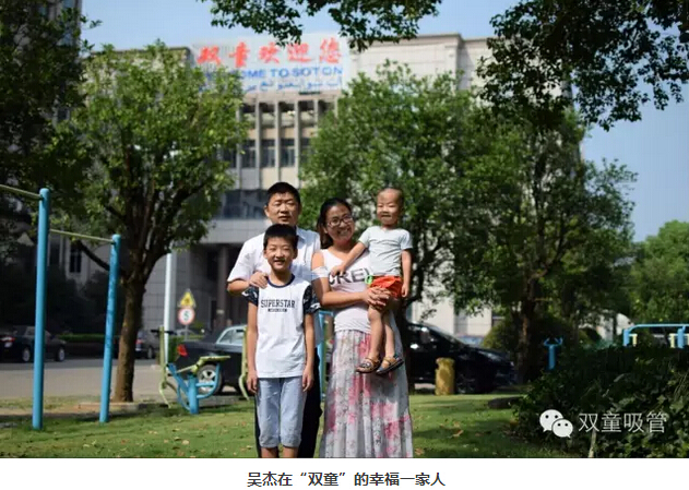 事業(yè)蒸蒸日上的同時,吳杰還有一個幸福的小家庭。2009年,吳杰把老婆呂二燕也接來了“雙童”,在藝術(shù)吸管崗位工作。2012年,由于要照顧孩子,老婆呂二燕辭去了工作在家相夫教子。同年,吳杰又喜得一子,一家四口住在公司安排的行政套房內(nèi),一家子真正把家安在了“雙童”。