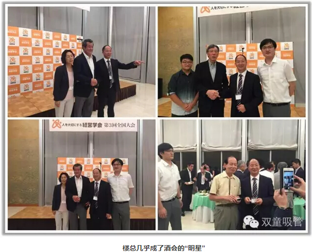 在會議主辦方安排的酒會交流活動中,樓總與會代表繼續(xù)就人本經(jīng)營開展深入的交流,雖然主辦方安排了簡單的餐飲,但樓總幾乎沒有任何停頓的時間空隙停下來吃飯,期間共接待了70多位日本企業(yè)經(jīng)營者和學者教授的頻繁交流和提問,幾乎是一分鐘也沒有停頓:交換名片、相互介紹、提問解答、拍照留言......