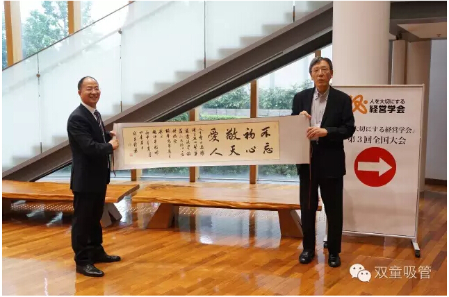 在啟程前就事先懇請義烏著名的書法家貝立新老師將本次演講主題的《不忘初心、敬天愛人》做成書法作品,作為禮品帶到日本,并在活動結束后敬獻給坂本光司老師以致感謝。書法的落款附句是“人生云水過,難得自然心,繁花落盡,洗盡鉛華,不忘初心,方得始終。”樓總將演講內容的主題與致謝禮品融為一體,足以說明樓總在為人處世和做事細節(jié)上的極致追求。