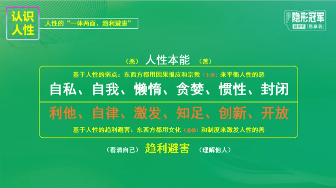 但人性的真相是:所有的人性假設(shè)都不抵“人性本能”。所以要理解人性本能背后的貪婪、欲望、動機(jī)和行為失控而導(dǎo)致的緣起。理解一切看似非理性行為決策的背后的人性劣根性。