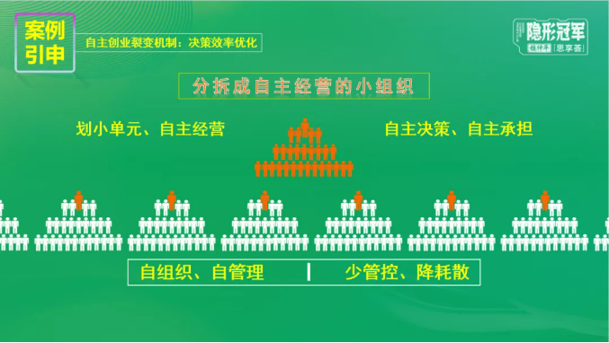 正如雙童自主創(chuàng)業(yè)裂變機(jī)制中的劃小單元、拆分自主經(jīng)營,便是治理優(yōu)化結(jié)構(gòu)優(yōu)化決策鏈,減少官僚和博弈的一大例證,極大提高了人效。