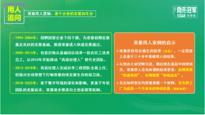 雙童的用人方式是從外部引進(jìn)逐漸過渡到內(nèi)部培養(yǎng),其邏輯是基于企業(yè)的發(fā)展和生存而變化的。前期是需要“快速承擔(dān)”的,長期則更看重“持續(xù)成長”。