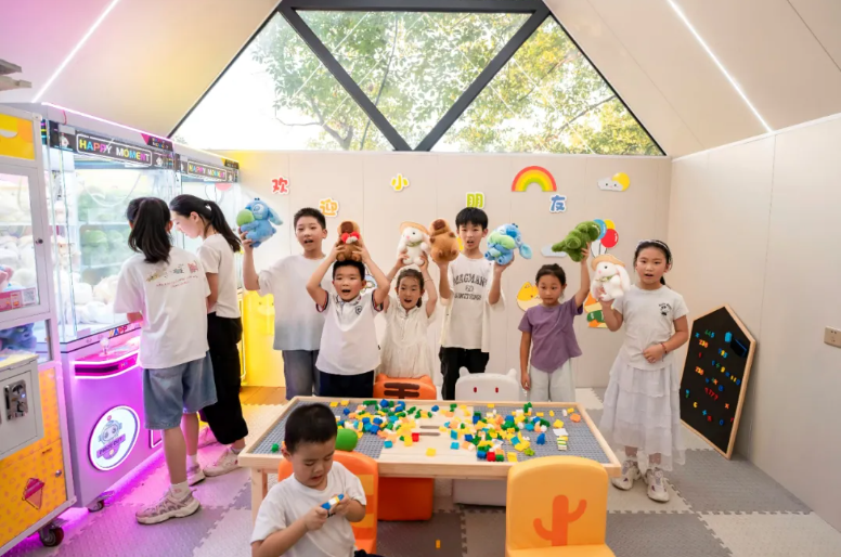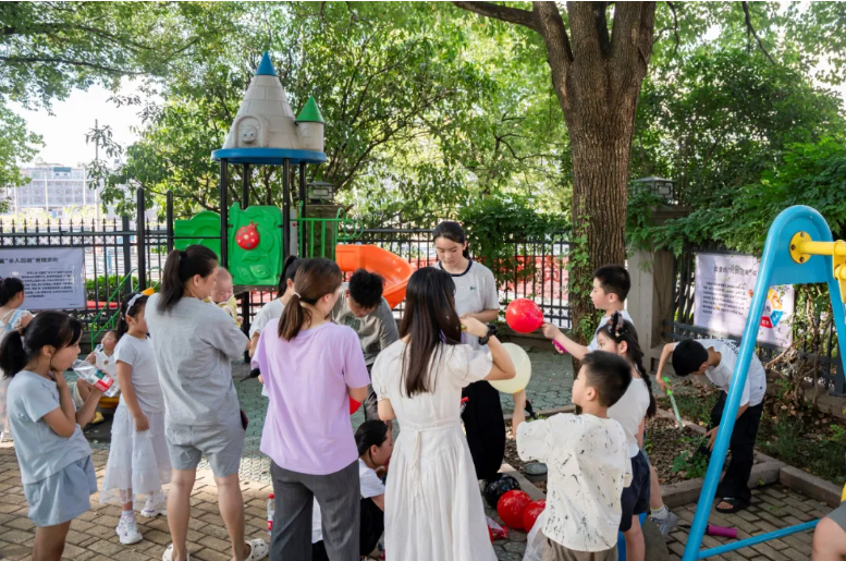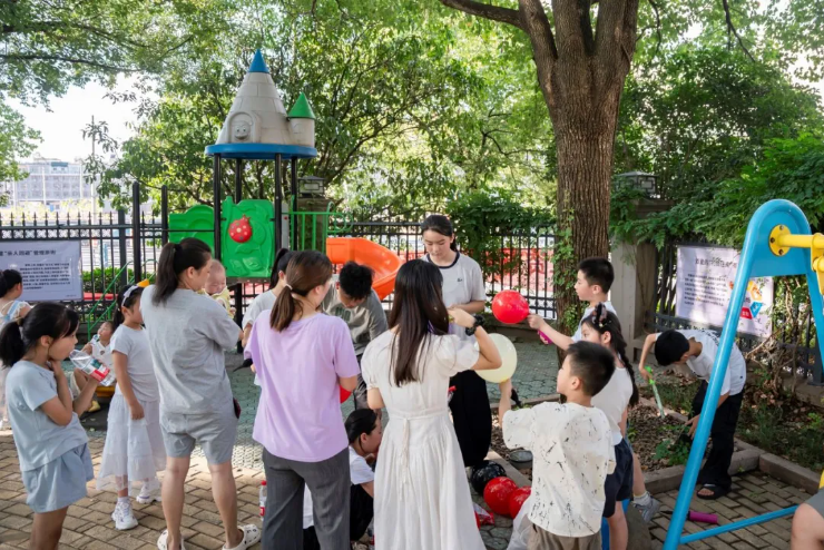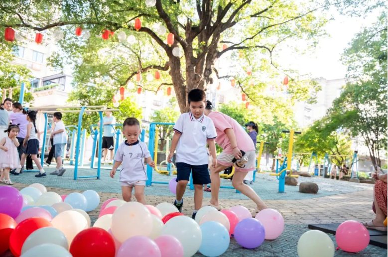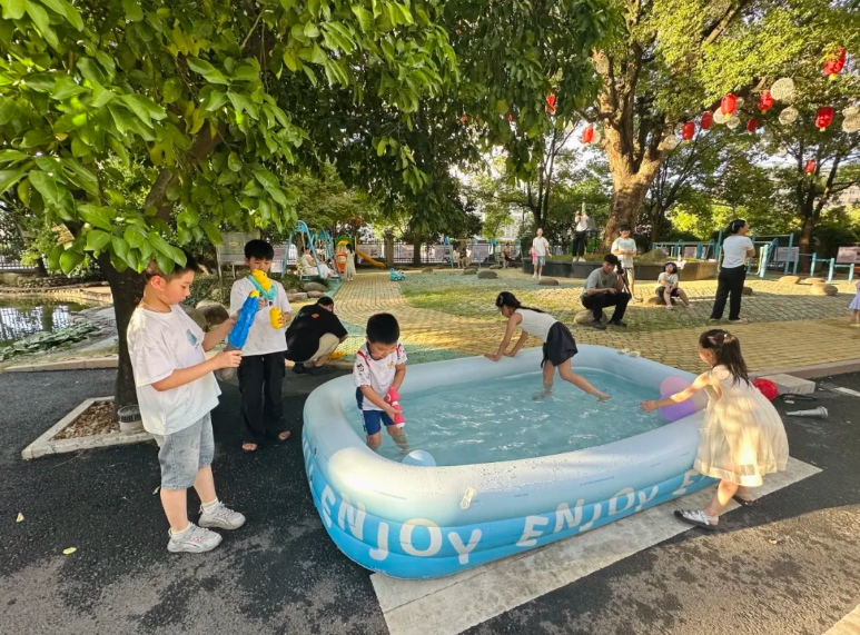 活動現(xiàn)場充分利用了雙童的場地優(yōu)勢:雙童一號樹的濃密樹蔭下,布置了兩個大充氣泳池和其他游戲設施;新建成的森林長廊中,抓娃娃機、積木、課外書一應俱全,儼然一個童趣小天地。小朋友們迅速沉浸在這場夏日盛宴中:泳池里水花四濺、笑語不斷,長廊間專注抓娃娃、拼積木的身影隨處可見,一號樹下,各種趣味游戲也正熱烈進行。