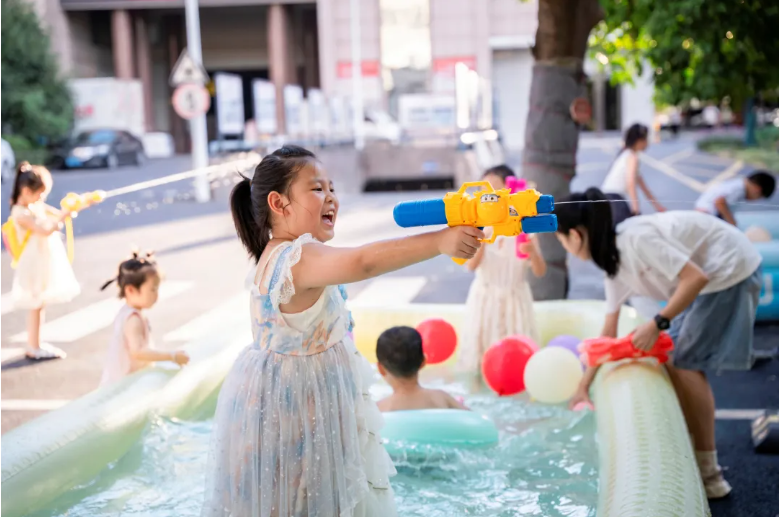 見到一旁裝飾的氣球,小朋友們靈光一閃,放了許多在泳池里,更添了幾分樂趣。他們迫不及待地跳進水中,霎時間水花四濺、笑聲不斷,場面熱鬧非凡。大家不停地把手中的水槍裝滿水,三兩成群地追逐嬉戲。守在泳池里的小朋友則成了“固定據(jù)點”,仗著火力充足,不停地向周圍“開火”掃射。